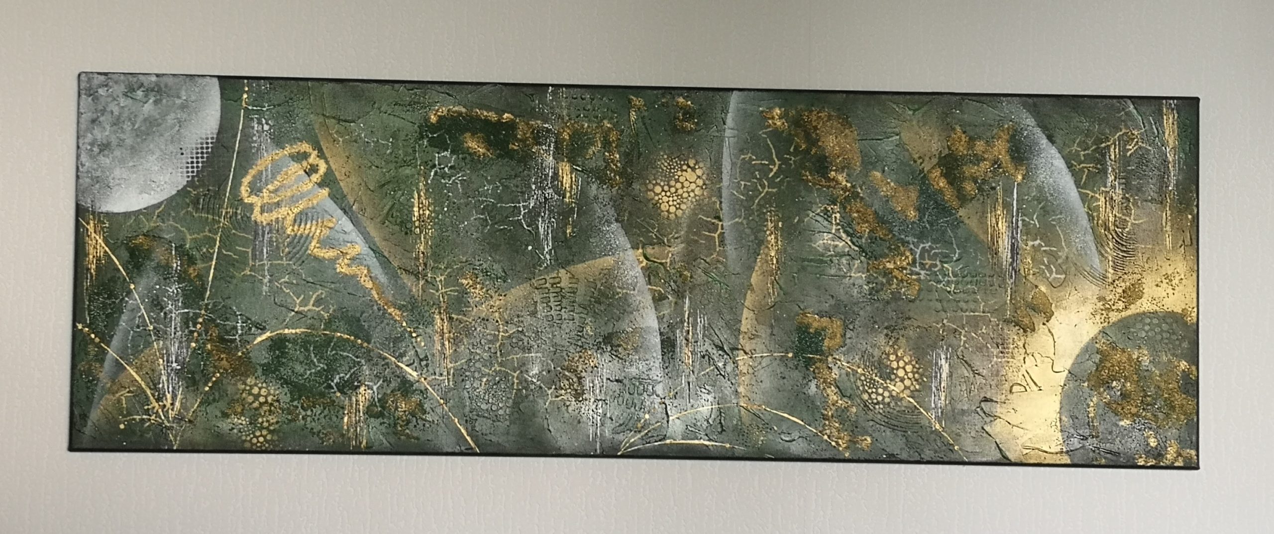 Ce tableau de style abstrait, à l'acrylique laisse libre cours à l'imagination: la terre, la végétation, la galaxie, un jardin japonais, un autre monde, votre monde …
