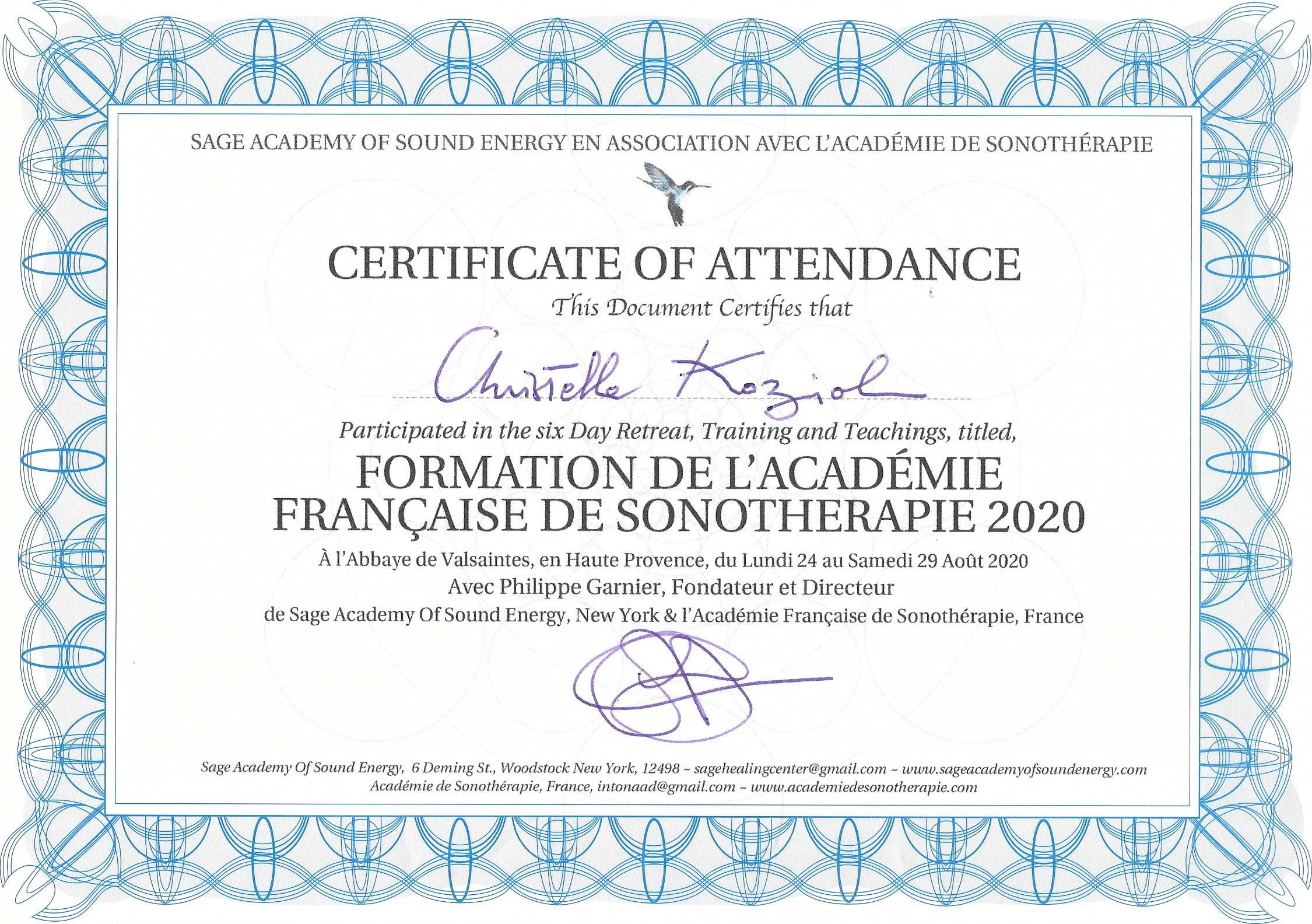 Ma formation s'est effectuée auprès de Mr Philippe Garnier, sonothérapeute reconnu , ayant principalement exercé à New York. L'enseignement que j'ai reçu sur les diapasons thérapeutiques, les gongs, les bols de l'Himalaya et les bols de cristal est pour moi un atout supplémentaire au service de ma patientèle .
