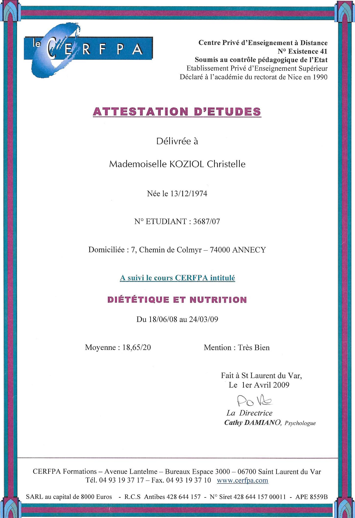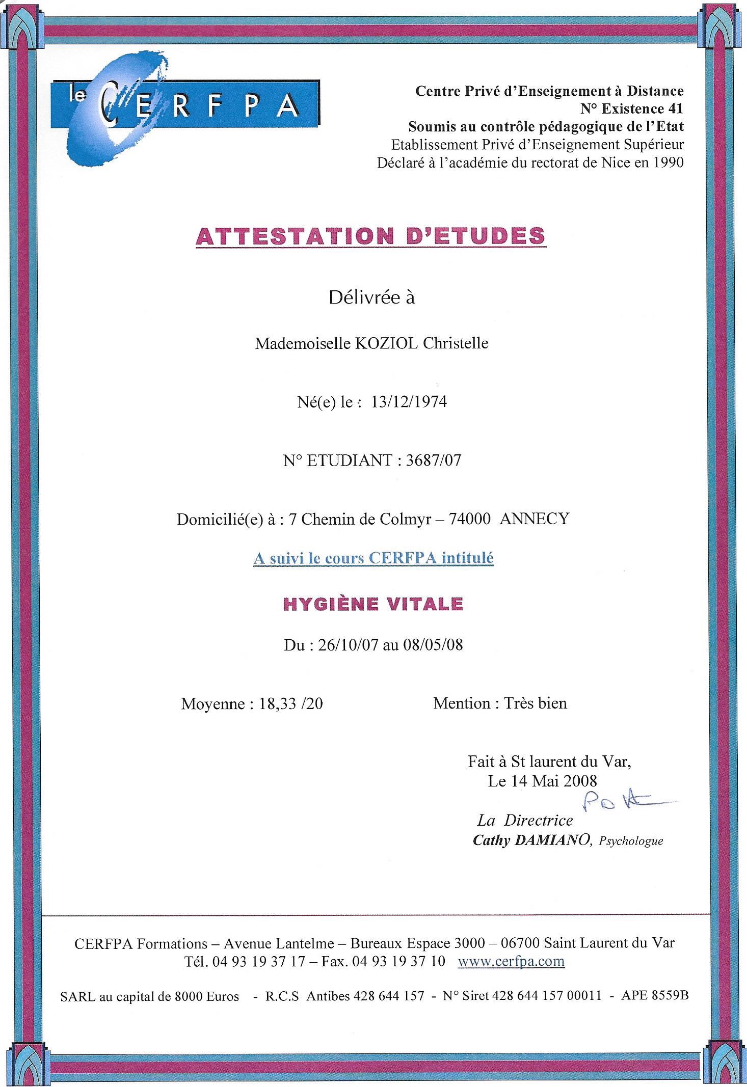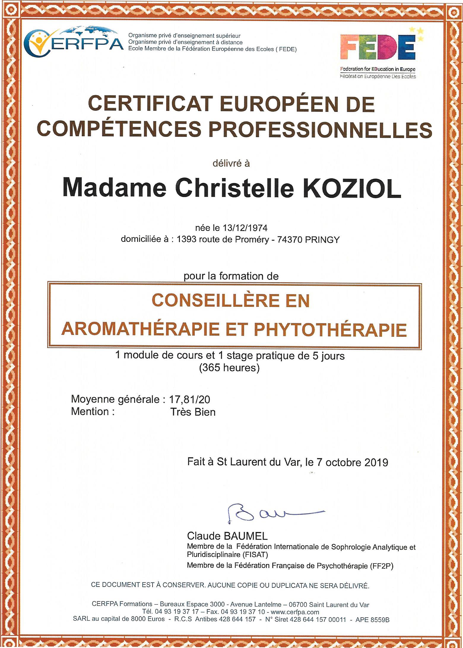En parallèle, j'ai également débuté une formation de Naturopathe au CERFPA de Nice. Mon travail et mon investissement m'ont permis de valider les modules suivants et d'obtenir un certificat Européen en phytothérapie et en aromathérapie: